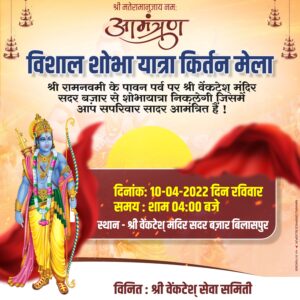 बिलसपुर-: प्रतिवर्ष की तरह भगवान राम की झांकी के साथ रामनवमी के दिन शोभायत्रा का आयोजन -श्री वैकटेश सेवा समिति,श्री रामनवमी शोभायात्रा समिति के तत्वाधान मे किया जाता रहा है इस वर्ष भी रामनवमी के दिन झांकी के साथ भगवान राम की शोभायत्रा हेतु बैठक आहूत की गई है । जिसमे सभी भक्तो से बैठक मे शामिल होने की अपील है ।