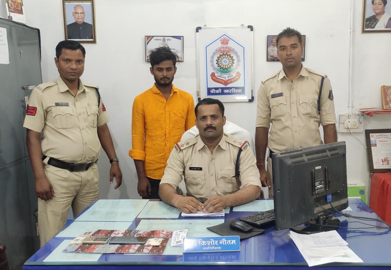 *रायगढ़* । पुलिस अधीक्षक रायगढ़ श्री अभिषेक मीना के कुशल दिशा निर्देशन तथा एडिशनल एसपी श्री लखन पटले व एसडीओपी खरसिया श्रीमती निमिषा पाण्डेय के मार्गदर्शन पर चौकी खरसिया पुलिस को साइबर क्राईम में एक और सफलता हाथ लगी है । चोरियों पर अंकुश लगाने क्षेत्र में चौकी प्रभारी खरसिया उप निरीक्षक नंद किशोर गौतम रात्रि गस्त व पेट्रोलिंग सुदृढ कर संदिग्धों से कड़ी पूछताछ एवं प्रतिबंधात्मक कार्रवाई की जा रही है । इसी क्रम में दिनांक 27.05.2022 को होटल चेकिंग के दौरान चौकी प्रभारी को एक संदिग्ध व्यक्ति मिला जो गलत-नाम पता बताकर रूकने का संदेह हुआ जिसके समानों की जांच की गई उसके पास 28 एटीएम कार्ड मिला, कड़ी पूछताछ में जौनपुर उत्तरप्रदेश का मूल निवासी संदिग्ध व्यक्ति खरसिया आने का कारण नही बता पाया जिसकी गतिविधियों संदिग्ध पाये जाने पर अपराध की रोकथाम के लिए खरसिया पुलिस द्वारा संदिग्ध *अनुराग यादव पिता अमर बहादुर उम्र 24 साल निवासी उटरूकला थाना वक्सा जिला जौनपुर उत्तरप्रदेश* पर प्रतिबंधात्मक कार्यवाही कर जेल भेजा गया ।