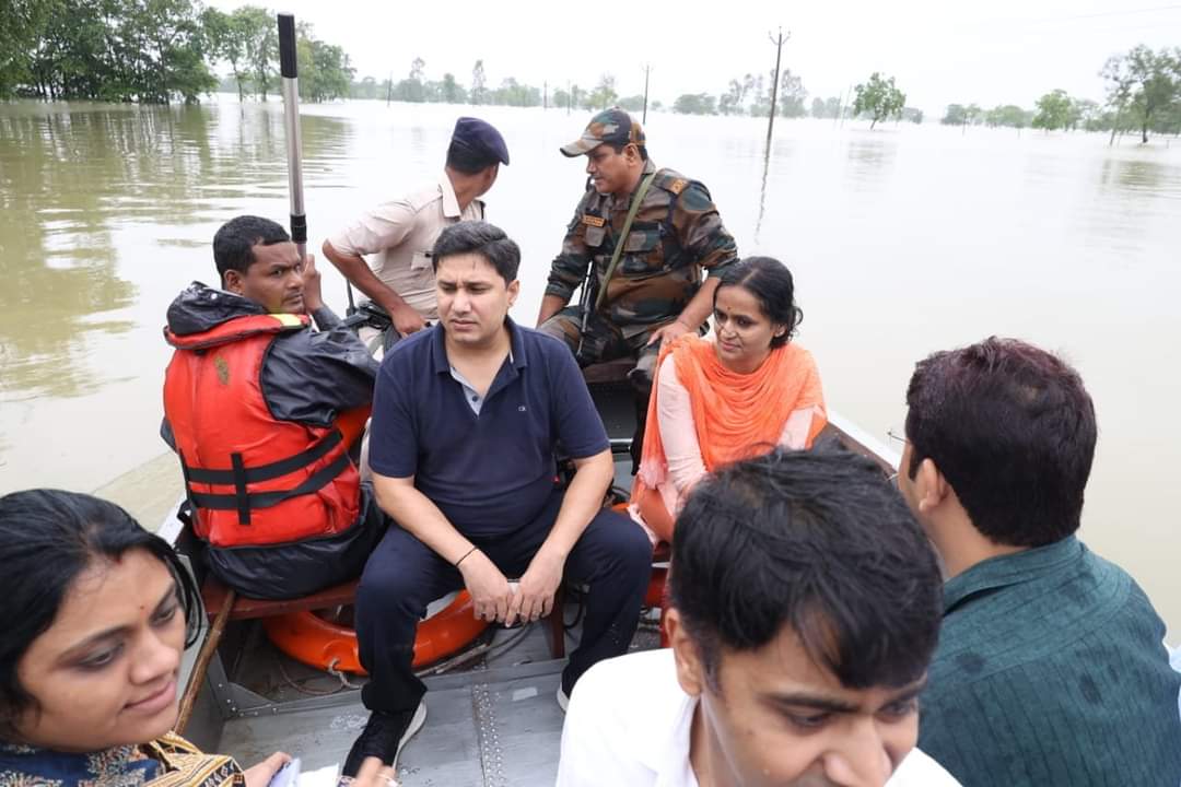 नाव से बाढ़ प्रभावित इलाकों में पहुंचे कलेक्टर और एसपी, विधायक रायगढ़ भी रहे साथ