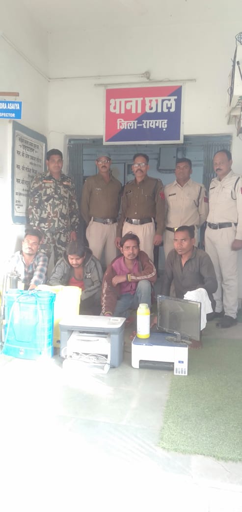 *रायगढ़* । एसपी श्री अभिषेक मीना के दिशा निर्देशन एवं एएसपी श्री संजय महादेवा तथा एसडीओपी खरसिया श्रीमती निमिषा पाण्डेय के मार्गदर्शन पर आज दिनांक 20.11.2022 को थाना प्रभारी छाल निरीक्षक जितेन्द्र एसैया के नेतृत्व में #छाल पुलिस द्वारा दुकानों के छत के शीट तोड़कर सामनों की चोरी करने वाले चार आरोपियों को चोरी की सारे सामनों सहित गिरफ्तार किया गया है । *आरोपियों द्वारा 10 और 11 नवंबर को ग्राम हाटी के एक कम्प्युटर दुकान और एक खाद बीज भंडार की दुकान पर चोरी* किये थे ।