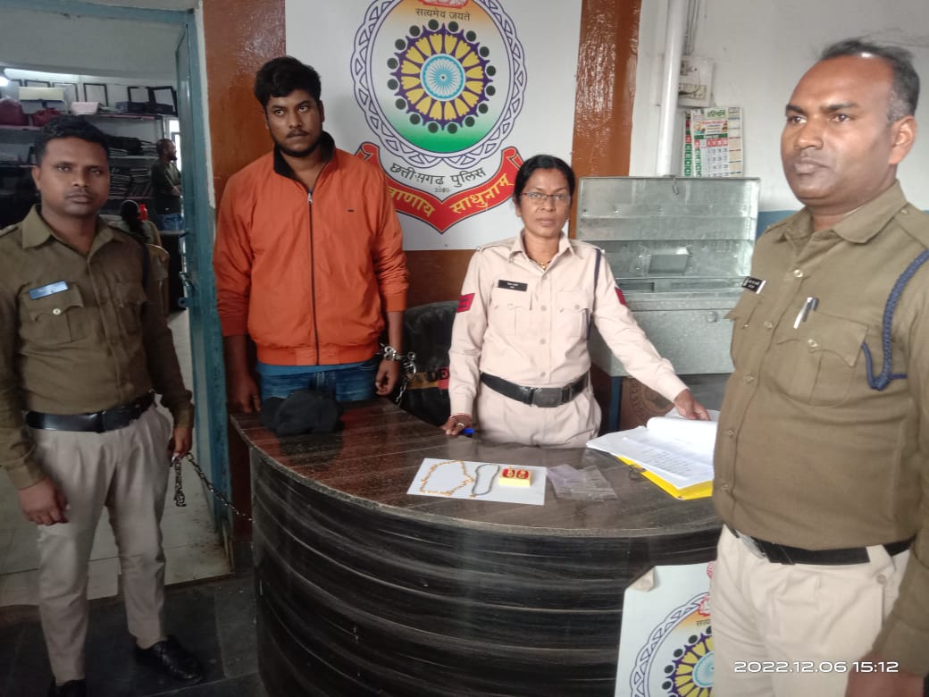 साइबर सेल/चौकी प्रभारी जूटमिल उप निरीक्षक कमल किशोर पटेल को उनके सक्रिय मुखबिर से सूचना मिला कि एक व्यक्ति ट्रांसपोर्ट नगर बस स्टैंड के पास हाथ में एक काले रंग का बैग लिए हुए घूमते देखा गया है जो आसपास के लोगों एवं राहगीरों को रुपए की अति आवश्यकता बताकर एक सोने की चेन कम दाम में बेचने की बात कर सौदा कर रहा था । मुखबिर सूचना पर उपनिरीक्षक कमल किशोर पटेल द्वारा वरिष्ठ अधिकारियों को अवगत कराकर उनके मार्गदर्शन पर साइबर सेल और जूटमिल पुलिस की संयुक्त टीम बनाकर संदेही पतासाजी के लिये रवाना कियागया । पुलिस टीम द्वारा ट्रांसपोर्टनगर में संदेही को घेराबंदी कर हिरासत में लिया गया जिससे पूछताछ करने पर अपना नाम रंजन बारिक निवासी बेलपहाड़ झाड़सुगुड़ा उड़ीसा का रहने वाला बताया जिसके पास रखे बैक को खुलवाकर चेक करने पर थैले के अंदर एक सोने का चेन एक सोने का मंगलसूत्र दुकान का झुमका मिला । उक्त जेवरातों के संबंध में कड़ाई से पूछताछ करने पर आरोपी बताया कि वर्ष 2021 में संबलपुर के कंपनी में प्राइवेट नौकरी करता था । नौकरी छूट जाने पर रायगढ़ काम की तलाश में आता-जाता था । इस दौरान फरवरी 2022 में रायगढ़ के कांशीराम चौक के पास एक सूने मकान में सोने का मंगलसूत्र, 1 जोड़ी सोने का झुमका और 20-25 हजार रुपए नकद चोरी किया और चोरी का सामान लेकर बेलपहाड़ भाग गया था । बेलपहाड़ में ज्वेलरी में सोने का जेवरात बेचना चाहा तो ज्वेलर बिल दिखाने बोला तब बेच नहीं पाया और ज्वेरात घर में ही रखा था । चोरी में मिले नगद 20-₹25,000 को खर्च कर दिया । रूपये खर्च के बाद फिर दिनांक 04.12.2022 को रायगढ़ आया और ओवर ब्रिज के नीचे ज्वेलर दुकान में ज्वेलर को सोने का चेन दिखाने बोला और मौका देखकर सोने का चेन चोरी का दुकान से भाग गया था। दिनांक 05.12.2022 को ओडिशा जाने वाली बस पकड़ने के लिए ट्रांसपोर्ट नगर बस स्टैंड गया और सोने का चेन और अन्य जेवरात को कम दाम में बेचने ग्राहक तलाश कर रहा था और पुलिस पकड़ ली । आरोपी से *एक सोने का चैन, सोने का मंगलसूत्र और सोने का कान का झुमका जुमला करीब ₹1,30,000 का चोरी का जेवरात जप्त* कर *आरोपी रंजन बारिक पिता शिबाराम बारिक उम्र 26 साल निवासी गुमाडेरा तारा कॉलोनी एनएसी मुंशीपार्टी के पीछे थाना बेलपहाड़ जिला झाड़सुगुड़ा उड़ीसा* पर पुलिस चौकी जूटमिल में धारा 41(1+4)CrPC/379 IPC की कार्यवाही कर जूटमिल पुलिस द्वारा न्यायिक रिमांड पर भेजा गया है । वरिष्ठ अधिकारियों के मार्गदर्शन पर सूचना संकलन में लगे साइबर सेल के आरक्षक पुष्पेन्द्र जाटवर और महेश पंडा की आरोपियों की पतासाजी, गिरफ्तारी में जूटमिल पुलिस के साथ अहम भूमिका रही है । साइबर सेल प्रभारी द्वारा आरोपी के अपराधिक रिकार्ड की जानकारी ली गई जो रायगढ़ के अलावा झारसुगुड़ा, ओड़िशा में भी चोरी में 