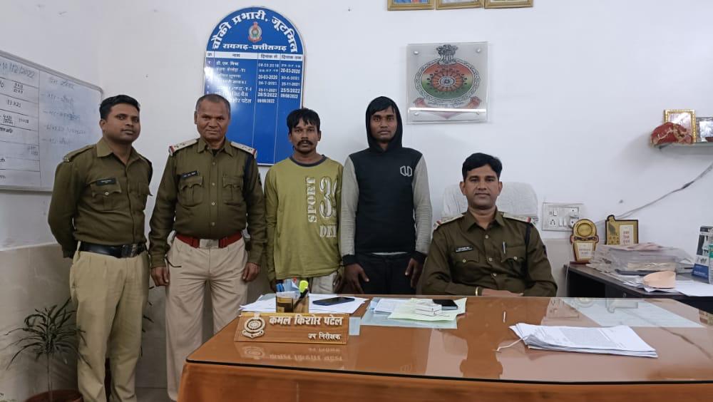 माल मुल्जिम की पतासाजी दौरान सायबर सेल/ चौकी प्रभारी जूटमिल उपनिरीक्षक कमल किशोर पटेल द्वारा घटनास्थल के आसपास सीसीटीवी फुटेज चेक कर अपने मुखबिरों से जानकारी लिये जिस पर घटना दिनांक की रात्रि क्षेत्र के आदतन चोर अनिल मिर्धा और अजय चौहान को देखे जाने की सूचना मुखबिरों से मिली । दोनों की जानकारी लेने पर दोनों घर से नदारद मिले, पुलिस दोनों पर निगाह रखे हुए थी कि आज दोपहर अमलीभौना के पास दोनों संदेही पिकअप को बिक्री के लिए लोगों से चर्चा करते देखे गए । चौकी प्रभारी के नेतृत्व में तत्काल चौकी जूटमिल के उपनिरीक्षक आर.एस. नेताम के हमराह स्टाफ मौके पर जाकर घेराबंदी कर दोनों संदेही अनिल मिर्धा अजय चौहान को हिरासत में लेकर चौकी लाया गया । दोनों से हिक्मत अमली से पूछताछ करने पर अपराध स्वीकार कर किए जिनके मेमोरेंडम बयान पर छिपा कर रखे हुए पिकअप वाहन सीजी 13 L- 2968 कीमत 2.50 लाख रुपए को बरामद कर *आरोपी (1) अनिल मिर्धा पिता कृष्ण मिर्धा उम्र 32 साल मिट्ठुमुड़ा दुर्गाचौक सुरेश यादव का मकान चौकी जूटमिल (2) अजय चौहान पिता स्वर्गीय साहेब लाल चौहान उम्र 28 साल सोनुमुड़ा बजरंगडिपा बुजु सोनकर का मकान चौकी जूटमिल* को वाहन चोरी के अपराध में गिरफ्तार कर गिरफ्तारी की सूचना उसके परिजनों को दी गई है । माल मुल्जिम पतासाजी में सायबर सेल/ चौकी प्रभारी जूटमिल उपनिरीक्षक कमल किशोर पटेल के नेतृत्व में चौकी जूटमिल के उपनिरीक्षक आर.एस. नेताम आरक्षक बनारसी सिदार, धनुर्जयचंद बेहरा, विनय तिवारी की अहम भूमिका रही है ।