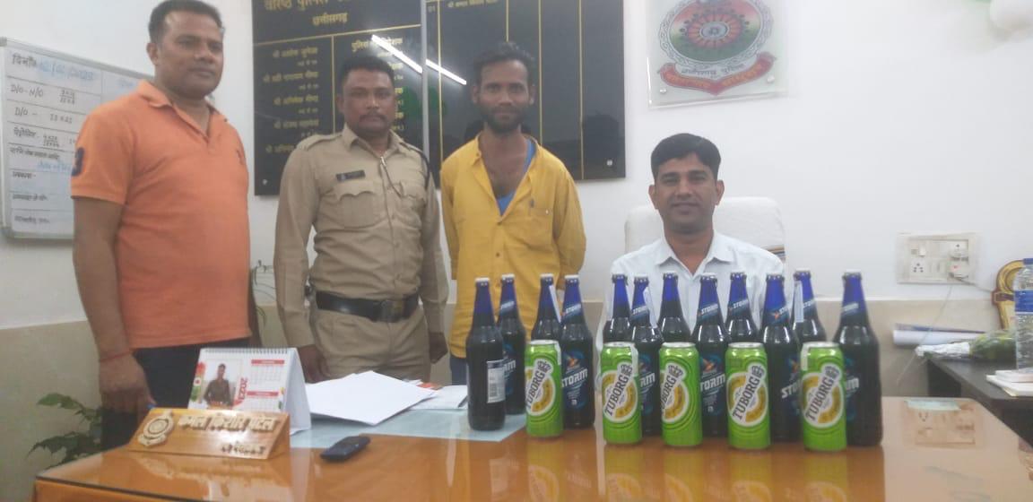 *रायगढ़* । कल दिनांक 06.02.2023 को टाउन पेट्रोलिंग दौरान थाना प्रभारी जूटमिल उपनिरीक्षक कमल किशोर पटेल को मुखबिर से सूचना मिली कि एक व्यक्ति प्लास्टिक झोले में गढ़उमरिया रोड से कांशीराम चौक की ओर शराब लेकर क्षेत्र में अवैध बिक्री के लिए लेकर आ रहा है । सूचना पर थाना प्रभारी द्वारा तत्काल थाने की पेट्रोलिंग पार्टी को जाकर कार्यवाही का निर्देश दिया गया । पेट्रोलिंग पार्टी द्वारा उड़ीसा रोड पर संदेही व्यक्ति को शराब लेकर आते हुए पकड़े, पूछताछ में संदेही अपना नाम ताराचंद टंडन पिता विजय कुमार टंडन उम्र 32 साल निवासी कबीर चौक एफसीआई गोदाम के आगे काबरा गली जूटमिल कमल ट्रांसपोर्ट का मकान थाना जूटमिल तथा स्थाई पता वार्ड क्रमांक 7 छुहीपाली थाना डबरा जिला सक्ति (छत्तीसगढ़) का रहने वाला बताया जिसके प्लास्टिक झोला को चेक करने पर उसमें 17 नग बियर (12 बोतल किंगफिशर स्ट्रांग प्रीमियम और 05 नग केन बियर) रखा पाया गया । संदेही पूछताछ में अंग्रेजी शराब अवैध बिक्री के लिए लेकर जाना बताया । आरोपी से अंग्रेजी शराब 17 नग बियर कीमत ₹2520 का जप्त कर आरोपी के कृत्य पर थाना जूटमिल में धारा 34(2),59(क) आबकारी एक्ट के तहत कार्यवाही कर आरोपी ताराचंद टंडन को न्यायिक रिमांड पर भेजा गया है । थाना प्रभारी जूटमिल उप निरीक्षक कमल पटेल के साथ कार्यवाही में सहायक उपनिरीक्षक शशिदेव भोय, भागीरथी चौधरी, प्रधान आरक्षक खीरेन्द्र जलतारे, आरक्षक सत्यानंद यादव और जितेंद्र दुबे की अहम भूमिका रही है ।