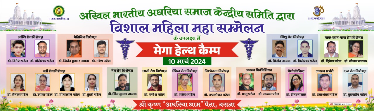 अतः अखिल भारतीय अघरिया समाज सभी अघरिया बंधुओं से अगामी 10 मार्च को समाज के इष्टदेव भगवान श्री कृष्ण के धाम पैता में पधारकर विशाल महिला सम्मेलन में सम्मिलित होने के साथ ही साथ अपने स्वास्थ्य की देखभाल हेतु निशुल्क चिकित्सीय परामर्श प्राप्त करते हुए अघरिया धाम के दर्शन का लाभ अवश्य उठाएं।