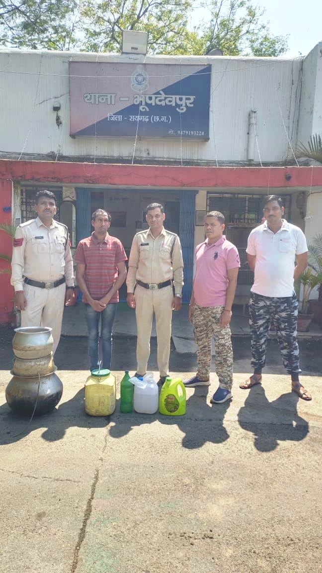 वहीं आज ग्राम पंडरीपानी में भूपदेवपुर पुलिस की टीम द्वारा योगेश कुमार साहू द्वारा किराना दुकान के सामने अवैध रूप शराब बिक्री करने की सूचना पर थाना प्रभारी भूपदेवपुर निरीक्षक राम किंकर यादव के निर्देशन पर प्रधान आरक्षक शंभू पांडे के हमराह पुलिस टीम द्वारा दबिश दी गई । जहां दुकान के सामने आम रोड में *आरोपी योगेश कुमार साहू पिता मदन लाल साहू उम्र 40 वर्ष साकिन अमलीडीपा पण्डरीपानी थाना भूपदेवपुर* को अवैध बिक्री के लिए शराब रखे पकड़ा गया । आरोपी के कब्जे से कुल 27 लीटर महुआ शराब (₹2,700) तथा शराब बनाने के पात्र गंज, पाइप (कीमती ₹1,500 रूपये) की जप्ती की गई है । पिछले दो दिनों में भूपदेवपुर पुलिस ने 35 लीटर अवैध महुआ शराब की जप्ती कर कार्रवाई किया गया है । शराब रेड कार्यवाही में प्रधान आरक्षक शंभू पांडे, आरक्षक बोधराम सिदार, विजय कुमार पटेल, महिला आरक्षक गौरी सिदार शामिल थे ।