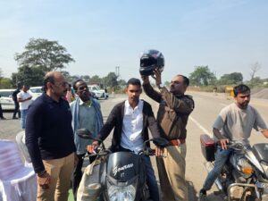 *रायगढ़, 29 नवंबर* । पुलिस अधीक्षक श्री दिव्यांग पटेल के दिशा-निर्देशन पर आमजन को यातायात नियमों के प्रति जागरूक करने और सुरक्षित व सुगम यातायात व्यवस्था सुनिश्चित करने जिले में पुलिस द्वारा लगातार मोटर व्हीकल जांच कार्यवाही और विविध जागरूकता कार्यक्रम चलाए जा रहे हैं। इसी क्रम में आज 29 नवंबर 2025 को हेलमेट उपयोग की अनिवार्यता पर जोर देने के उद्देश्य से यातायात पुलिस रायगढ़ और भूपदेवपुर पुलिस ने एनएच-49 स्थित चिन्हित ब्लैक स्पॉट कांशीचुंवा चौक पर जागरूकता कार्यक्रम आयोजित किया । यातायात और भूपदेवपुर पुलिस ने इस दौरान एनएच पर बिना हेलमेट दुपहिया चलाते मिले वाहन चालाकों का मोटर व्हीकल एक्ट के तहत चालानी कार्यवाही की और उन्हें नि:शुल्क हेलमेट प्रदाय कर हमेशा हेलमेट पहनने प्रेरित किया गया ।